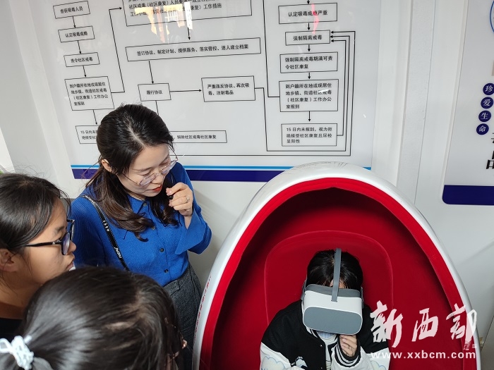 隨后,給同學們介紹了VR禁毒一體機,它采用了全新的四維技術(shù)。同學們熱情空前,積極去體驗和感覺VR一體機真實虛擬的各種戒毒情景。