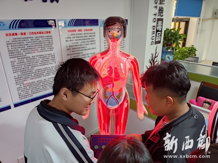 最后,同學們直觀地感受了LED人體吸毒血液演示裝置,它通過鼻吸、口服、靜脈注射以及過量吸毒死亡等方式,直觀體現(xiàn)了對人體各種器官造成的不同傷害。