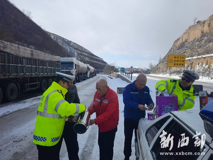 一名外地司機(jī)在接到交警送來(lái)的泡面后激動(dòng)地說(shuō):“在這里滯留了快13個(gè)小時(shí)了,車上帶的食物也都吃完了,沒(méi)想到交警同志專門給我們送來(lái)了泡面和熱水,真的是太感動(dòng)了?!保ㄍㄓ崋T 張娟娟 張旋)
