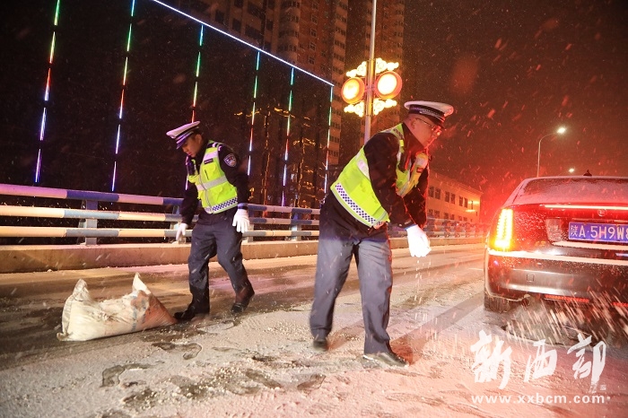 11月7日上午,府谷城區(qū)全體交警出動,提醒司機減速慢行,在城區(qū)易滑路段進行交通疏導(dǎo),在路面撒上融雪劑,幫助打滑車輛安全前行,各鎮(zhèn)交警中隊對轄區(qū)道路進行巡邏預(yù)判,對高危道路進行臨時封閉,擺放提醒牌,進一步減少道路交通事故發(fā)生。