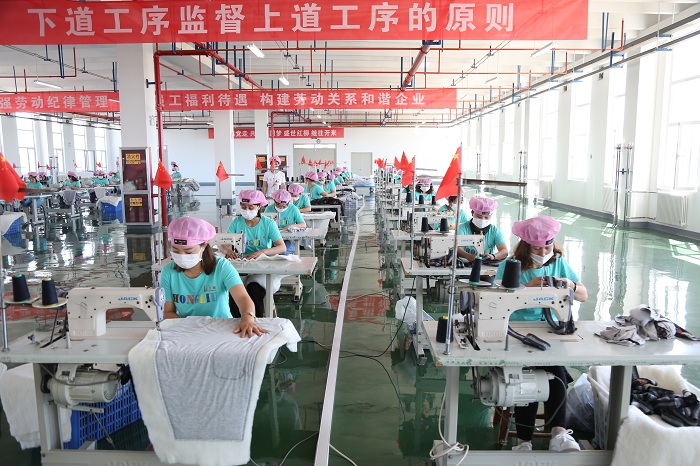 2020年6份,隨著榆陽輕紡產(chǎn)業(yè)園正式開園,8家輕紡企業(yè)率先入園投產(chǎn)。在寬敞明亮的制衣車間里,記者看到兩條現(xiàn)代化智能吊掛流水線正在有條不紊地運行著。隨著縫紉、熨燙、檢驗等工序全部完成,一件件全新的保暖褲就出爐了?!白詮囊M現(xiàn)代化智能吊掛流水線和自動化的裁剪、拉布設(shè)備,工作效率提高了30%,一天可以生產(chǎn)防寒服800多件,年生產(chǎn)30余萬件。”紅柳制衣負責(zé)人紀(jì)素梅說。