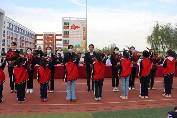 各班少先隊(duì)員代表為全校老師獻(xiàn)花。老師們接過鮮花,美麗的笑容在她們臉上綻放,幸福的感動(dòng)在他們心中流淌。