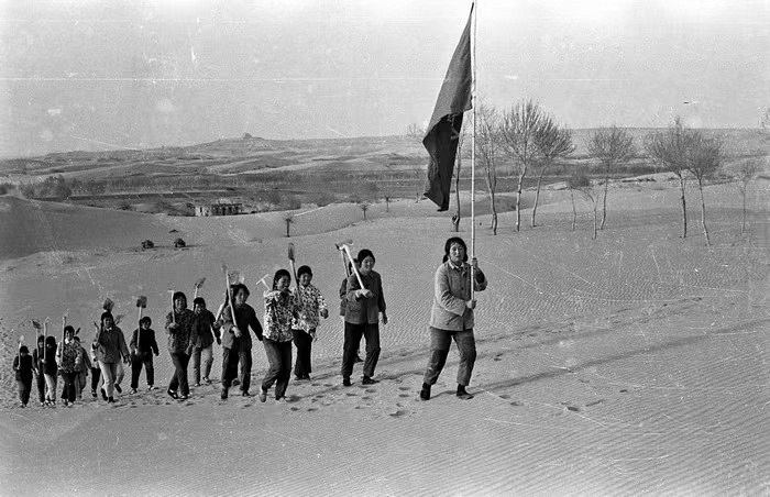 1974年,為積極響應黨中央、毛主席“植樹造林,綠化祖國”的偉大號召,改變惡劣的生態(tài)環(huán)境,54名平均年齡只有18歲的姑娘,組建起補浪河女子民兵治沙連的前身——補浪河公社 “長城姑娘治沙連”。在首任連長童軍的帶領下,她們打起背包,扛著紅旗,邁著堅實的腳步,向風沙侵蝕最嚴重的毛烏素沙漠南緣黑風口——補浪河進軍。“灑盡渾身千滴汗,走進沙漠戰(zhàn)惡狼”,開啟了治沙造林的艱難征程。
