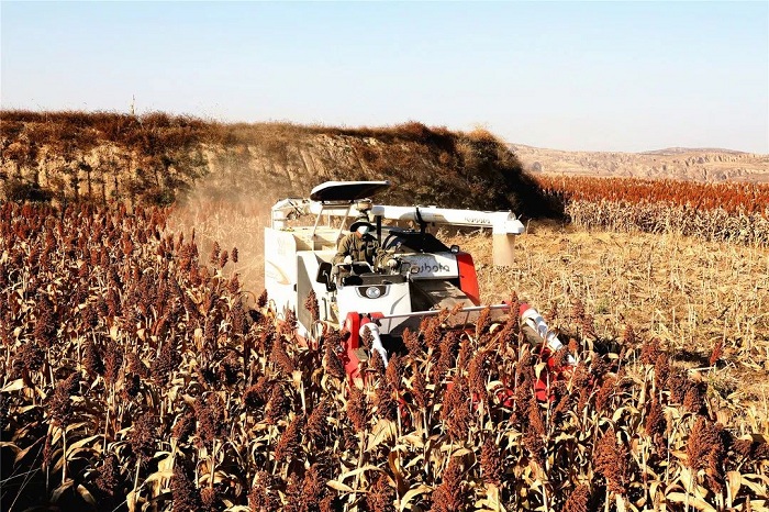 走進(jìn)大河塔鎮(zhèn)白南溝村,集中連片的大紅高粱成熟了,顆粒飽滿的高粱穗傲立枝頭,豐收景象染紅了黃土高原的千溝萬壑。收割機(jī)在田間地頭來回穿梭,伴隨著轟隆隆的馬達(dá)聲,高粱收割、摘穗、脫粒、秸稈粉碎一氣呵成。