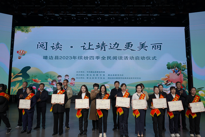 儀式宣讀了《靖邊縣2023年繽紛四季全民閱讀活動(dòng)倡議書(shū)》。表彰獎(jiǎng)勵(lì)了“靖邊最美讀書(shū)人” “書(shū)香家庭” “最美書(shū)香校園”。為縣文聯(lián)、縣公安局、靖邊中學(xué)、靖邊六小等部門(mén)、學(xué)校分別贈(zèng)送了黨政類(lèi)圖書(shū)、語(yǔ)文學(xué)習(xí)系列叢書(shū)等。學(xué)生代表集體朗誦了《三字經(jīng)》選段、《我們都是追夢(mèng)人》等。
