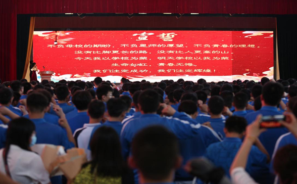 全體九年級畢業(yè)生在學(xué)生代表王藝博的帶領(lǐng)下莊嚴宣言,聲聲誓言震破蒼穹。