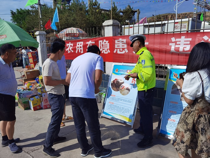夏季,由于天氣炎熱,許多人喜歡選擇更為便捷的摩托車和電動(dòng)車等車輛作為出行交通工具,但隨之而來的安全隱患也逐漸增多,為有效預(yù)防和減少道路交通事故的發(fā)生,6月17日,府谷公安交警新民中隊(duì)利用新民鎮(zhèn)龍王廟村舉辦廟會(huì)的有利時(shí)機(jī),走進(jìn)廟會(huì)現(xiàn)場(chǎng),向前來趕會(huì)的群眾開展農(nóng)村道路交通安全宣傳活動(dòng),讓村民在觀看戲曲的同時(shí),也提高了交通安全知識(shí)。