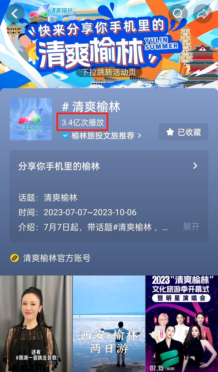 據(jù)抖音平臺數(shù)據(jù)顯示,截至2023年9月1日,抖音“#清爽榆林”話題已達3.4億次播放,其中亮點活動話題的播放量就很可觀。