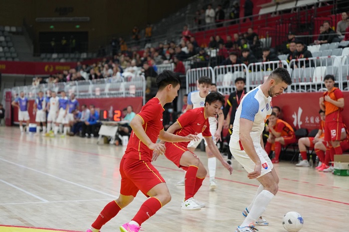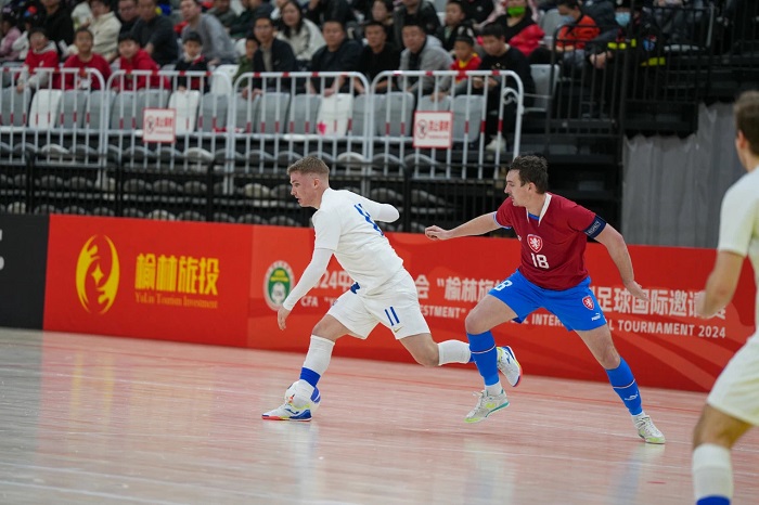 第二場比賽,中國隊迎戰(zhàn)斯洛伐克隊,現(xiàn)場吸引了眾多球迷入場觀賽、加油助威,氛圍達到頂峰。對決中,中國隊充分發(fā)揮反攻優(yōu)勢,在先失一球的情況下奮起直追,7分鐘時,中國隊5號凱賽爾在快速進攻中,抽射破門,將比分逼平。隨后中國隊17號陳智恒左路得球,小角度抽射得手,以2:1領先。在上半場即將結束時,斯洛伐克7號球員接隊友倒三角傳球?qū)⒈确职馄?,上半場?:2結束。