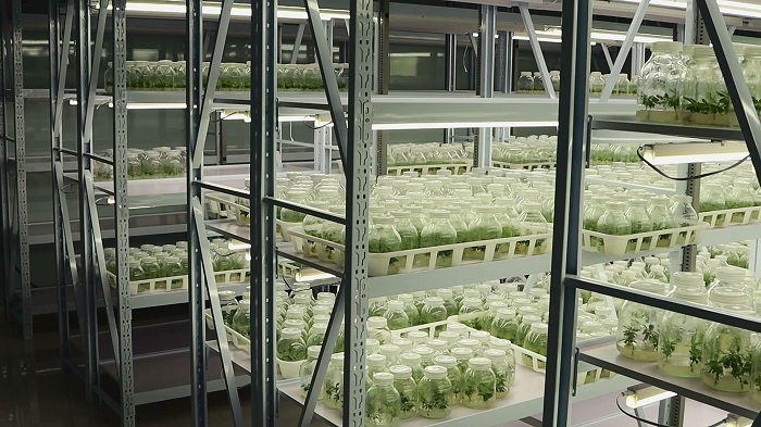 黃陵是蘋果、翡翠梨等果品生產(chǎn)大縣,多年來,果樹的品種苗木等因素制約當(dāng)?shù)毓麡I(yè)發(fā)展。陜西薔薇農(nóng)業(yè)科技有限公司2021年落戶黃陵以來,主要從事優(yōu)質(zhì)苗木無性繁育、優(yōu)良品種引進(jìn)推廣、先進(jìn)農(nóng)業(yè)技術(shù)應(yīng)用示范、種質(zhì)資源開發(fā)保存等,開展一系列技術(shù)研究與生產(chǎn)推廣工作,填補(bǔ)了黃陵乃至延安地區(qū)苗木組培繁育的空白。陜西薔薇農(nóng)業(yè)科技有限公司總經(jīng)理姜笑介紹:“脫毒種苗和常規(guī)苗木相比最關(guān)鍵的優(yōu)勢是脫除了果樹本身所攜帶的病毒,進(jìn)而減少了果農(nóng)在種植過程中由于感染病毒而產(chǎn)生的損失,同時脫毒種苗比常規(guī)的種苗長勢更加健壯。我們通過植物脫毒技術(shù)和組植培養(yǎng)技術(shù)產(chǎn)出優(yōu)質(zhì)的脫毒種苗,現(xiàn)在繁育基地一年可以生產(chǎn)優(yōu)質(zhì)的脫毒種苗30萬株以上。”