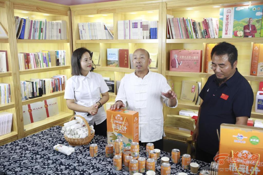 ▲秦彩彩、丁文軍、張永強向沿黃九?。▍^(qū))的媒體記者介紹家鄉(xiāng)文化和農(nóng)特產(chǎn)品