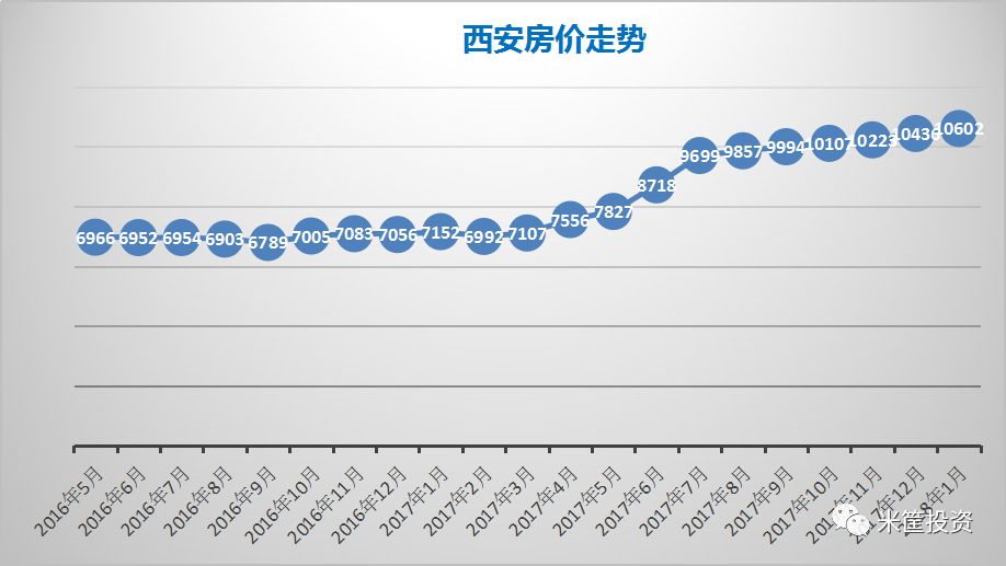 在整個(gè)中國(guó)房?jī)r(jià)暴漲的2016年,西安沒(méi)什么動(dòng)靜,那時(shí)的資金還在北上廣深鬧騰,沒(méi)人關(guān)注西北這個(gè)門(mén)戶(hù)城市。但到2017年,隨著房?jī)r(jià)暴漲輪動(dòng)到二線城市,西安也開(kāi)始異動(dòng),尤其是在2017年7月、8月,房?jī)r(jià)從7800直接飆到9600。