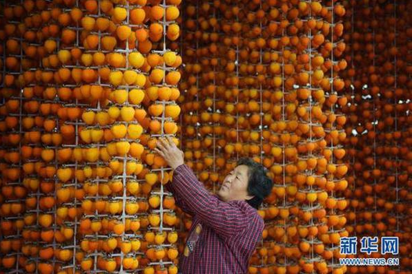 10月25日,陜西省富平縣曹村鎮(zhèn)太白村村民在晾曬柿子。金秋時節(jié),被稱為“柿子之鄉(xiāng)”的陜西省渭南市富平縣柿子成熟,當(dāng)?shù)剞r(nóng)民忙著柿子采摘、晾曬,制作柿餅,處處紅火繁忙。富平縣柿子總面積達13萬畝,柿子已成為當(dāng)?shù)厝罕娭赂辉鍪盏闹еP氯A社記者 劉瀟 攝