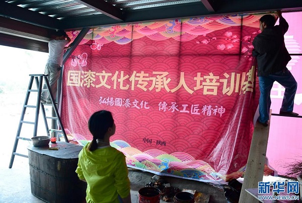 6月15日,袁端姣(中)指揮工人在公司后院入口處掛幕布。公司計(jì)劃面向社會(huì)開辦培訓(xùn)采漆、割漆及生漆加工的培訓(xùn)班,帶動(dòng)平利縣生漆產(chǎn)業(yè)發(fā)展。(新華社記者 邵瑞 攝)