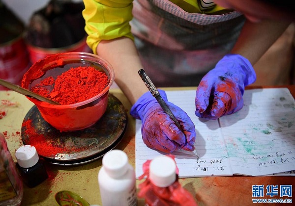 6月15日,袁端姣在記錄朱砂與桐油的混合比例。(新華社記者 邵瑞 攝)