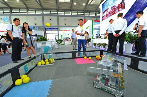 6月5日,曲江國際會(huì)展中心B1館西安雁塔展區(qū),來自西安歐亞學(xué)院信息工程學(xué)院的學(xué)生正在演示“智能投球機(jī)器人”。本報(bào)記者 劉強(qiáng)攝