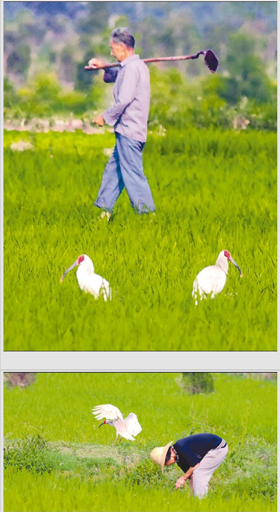 在秦嶺腹地漢中市洋縣,農(nóng)民在地里勞作,國寶朱鹮不時旁若無人地飛來覓食(如圖)。