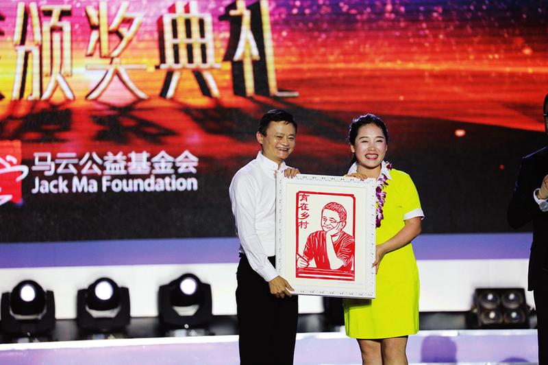 陜西獲獎(jiǎng)教師代表馮海燕送剪紙肖像給馬云