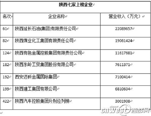 分別是:61位的陜西延長石油(集團(tuán))有限責(zé)任公司、82位的陜西煤業(yè)化工集團(tuán)有限責(zé)任公司、124位的陜西有色金屬控股集團(tuán)有限責(zé)任公司、182位的陜西東嶺工貿(mào)集團(tuán)股份有限公司、192位的西安邁科金屬國際集團(tuán)、199位的陜西建工集團(tuán)有限公司、422位的陜西汽車控股集團(tuán)。