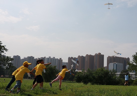 孩子們放飛自己制作的飛機(jī)模型