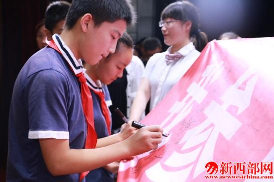 參與人員共同在“我參與,我成長,一起爭做中國好網(wǎng)民”的橫幅上簽字