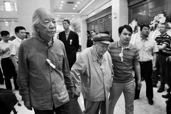 在低沉的哀樂聲中,前來悼念的各界人士依次緩緩步入咸寧廳,向陳忠實(shí)遺體默哀并三鞠躬。年已83歲的著名國(guó)畫家劉文西也在身邊人的攙扶下緩步走近陳忠實(shí)遺體,向其深鞠一躬,緊隨其后的是賈平凹。