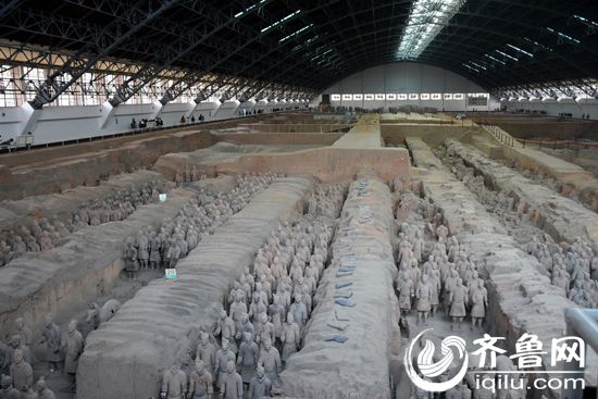 就在半坡遺址被發(fā)現(xiàn)20多年后,秦兵馬俑坑被發(fā)現(xiàn)。按照被發(fā)現(xiàn)的順序,分別定名一、二、三號(hào)坑?!?975國(guó)務(wù)院批準(zhǔn)在一號(hào)坑原址上建一座占地面積16000平方米的博物館,并在1979年10月1日正式對(duì)外開放。二號(hào)和三號(hào)展坑也陸續(xù)于1989年和1994年正式展出”。