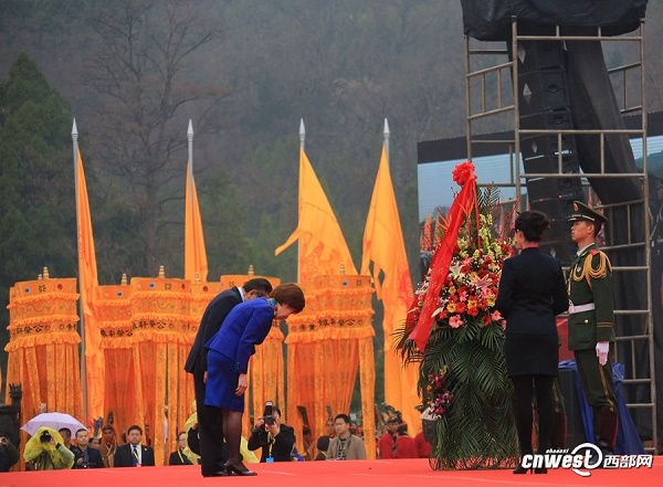 陜西省代省長胡和平恭讀祭文,“惟公元二零一六年四月四日,歲次丙申,節(jié)屆清明,炎黃子孫,聚首橋山之陽,謹(jǐn)以鮮花雅樂之奠,恭祭于我人文初祖軒轅黃帝之陵,其辭曰: