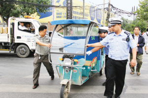 執(zhí)法人員現(xiàn)場查扣非法營運的三輪摩托車(記者李福民實習生余浩文/圖)