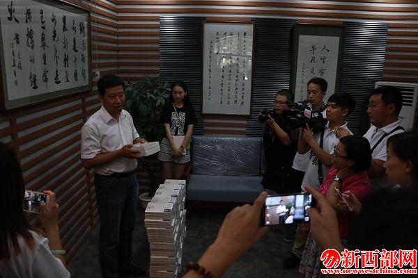 在路遙文學(xué)館,陜西省委網(wǎng)信辦網(wǎng)絡(luò)社會(huì)工作處處長(zhǎng)高志強(qiáng)向“青年志愛(ài)國(guó)情”陜西網(wǎng)絡(luò)媒體團(tuán)成員贈(zèng)送路遙作品《平凡的世界》。新西部網(wǎng) 師皎攝
