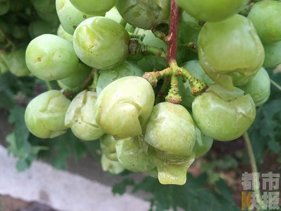 受災(zāi)最嚴(yán)重的應(yīng)該是葡萄園了,記者在葡萄園中看到,葡萄們都被砸出了裂痕,而這些裂痕,過不了多久,就會發(fā)生霉變,這將近一百多畝、即將上市的葡萄將會徹底絕收。