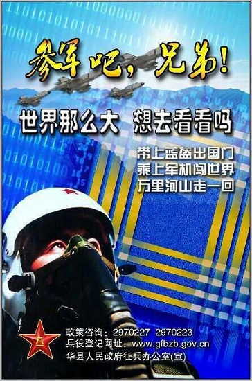 更具特色的是,該組宣傳畫配有極具網(wǎng)絡(luò)特色的宣傳語,包括“世界這么大,想去看看嗎?開上軍機(jī)闖世界、乘上軍艦去遠(yuǎn)航,萬里河山走一回?!边€有“有你國更強(qiáng)!從軍報國、舍我其誰;民族復(fù)興,熱血擔(dān)當(dāng)”等。同時,宣傳畫上還印有政策咨詢電話、兵役登記網(wǎng)址及二維碼,通過微信掃描后即可關(guān)注“華縣人民武裝部”官方微信平臺,可在線咨詢等。