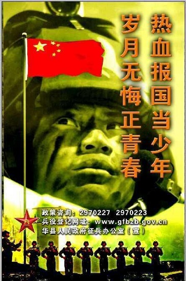 “蘭博基尼弱爆了,你不來試試坦克嗎?參軍吧,兄弟!到部隊考軍校,當(dāng)上軍官路更寬,退役后再國考,獎勵加分更容易?!边@是陜西省軍區(qū)渭南軍分區(qū)華縣人民武裝部今年征兵宣傳畫其中的一幅,而配圖是威武的坦克在硝煙彌漫的戰(zhàn)場快速前行。華商報記者發(fā)現(xiàn),華縣人民武裝部今年的征兵宣傳畫共9幅,內(nèi)容包括戰(zhàn)士負(fù)重匍匐前行、高原上武裝越野、駕駛戰(zhàn)機(jī)翱翔藍(lán)天等,背景配圖不但有滿臉汗水的戰(zhàn)士表情特寫,還有部隊在高山、雪原間武裝行進(jìn)的大場面。