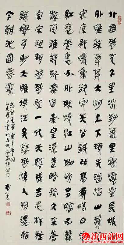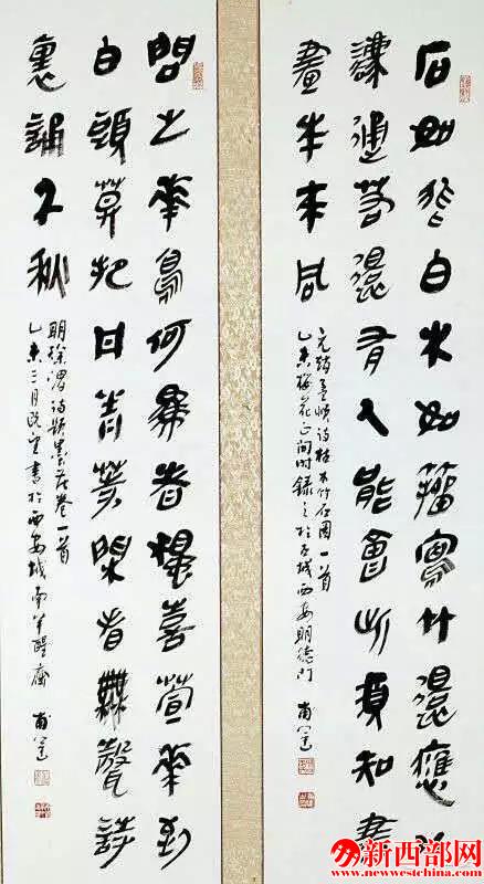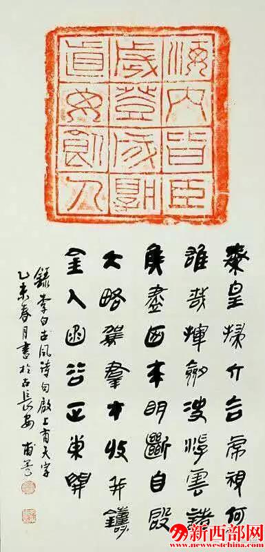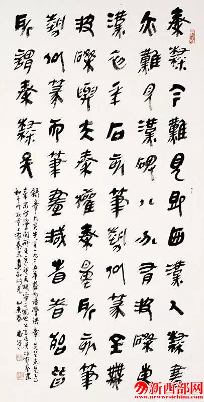 李教授一邊大量研究考古發(fā)掘出的秦隸資料,一邊臨習(xí)之,從青川木牘至里耶木牘,以解決秦文化在書法藝術(shù)中的表現(xiàn)方法及風(fēng)格,并最終形成一種獨具風(fēng)采的秦隸書法藝術(shù),有“華夏秦隸第一人”之譽。先生作品深受國人厚愛,兩岸四地所見頗多。其作品不僅被黨和國家領(lǐng)導(dǎo)人收藏,還被世界文化名人如日本的池田大作、馬來西亞的繼程法師收藏。