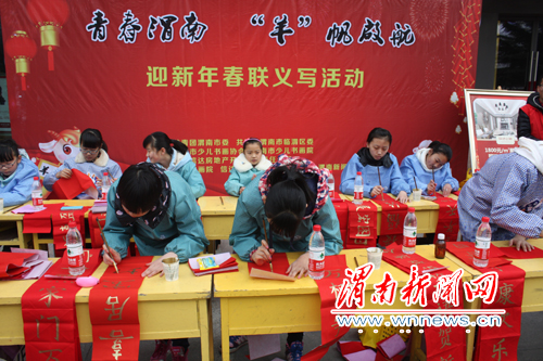 昨日上午,由渭南新聞網(wǎng)、共青團(tuán)渭南市委、共青團(tuán)渭南市臨渭區(qū)委、渭南公益網(wǎng)聯(lián)合舉辦的“青春渭南 “羊”帆起航 迎新春春聯(lián)義寫活動(dòng)”在渭南市信達(dá)廣場(chǎng)舉行。來(lái)自陜西書畫藝術(shù)社的書法大家和書畫院的孩子們一起,老少協(xié)作,為市民義寫春聯(lián),將新春祝福送給廣大市民。(記者 徐磊 實(shí)習(xí)記者 馬玥 攝影報(bào)道)