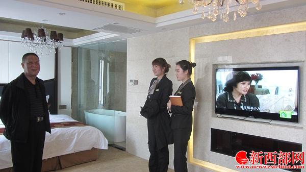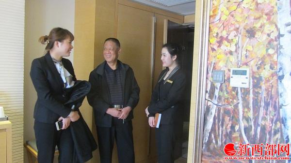 由工作人員陪同,陜西省養(yǎng)生協(xié)會(huì)會(huì)長(zhǎng)卜廣民(中)在四季華庭酒店客房參觀指導(dǎo)。新西部網(wǎng) 王順利攝