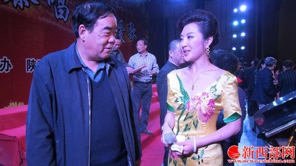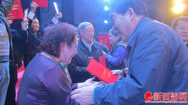 陜西省慈善協(xié)會會長劉維隆(前左)贊揚大賽主持人孫維對慈善公益事業(yè)辛勤工作。新西部網(wǎng) 王順利攝