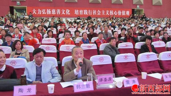 陜西省音樂家協(xié)會副主席、西安音樂學(xué)院副院長韓蘭魁(前排右一)點評2014全省“愛心歌曲大家唱”群眾歌詠演唱大賽。新西部網(wǎng) 王順利攝