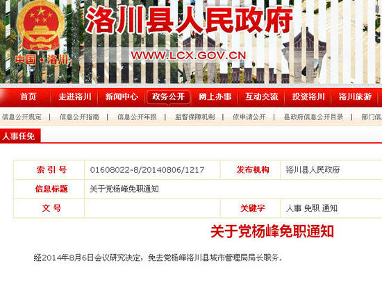 昨日下午,洛川縣城市管理局各辦公室工作正常,有的工作人員正準備上街清理野廣告,大家對黨某的事情并不知道太多,只說黨某被免職了,原因不明。在洛川縣政府網(wǎng)站,人事任免一欄中,關(guān)于黨某的免職只有簡單的一句話:經(jīng)2014年8月6日會議研究決定,免去黨某洛川縣城市管理局局長職務(wù)。而僅隔一行,就是黨某的任職通知。