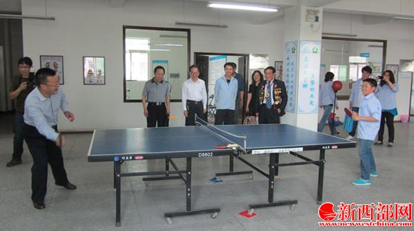 2014年5月20日下午,陜西省食品藥品監(jiān)督管理局局長胡小平(前左一)與西安華亞電子有限責任公司團委書記劉宏學(前右一)在文體中心體驗乒乓球運動。新西部網(wǎng) 王順利攝