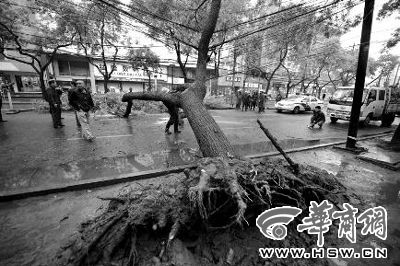 昨日上午,西安市東大街端履門(mén)十字以西,一棵行道樹(shù)倒在馬路中間,占據(jù)了大半車(chē)道 本報(bào)記者 葉原 攝