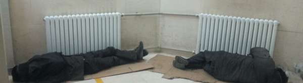 7日晚上,在人民路的自助銀行內(nèi),流浪者依偎著暖氣片睡覺。