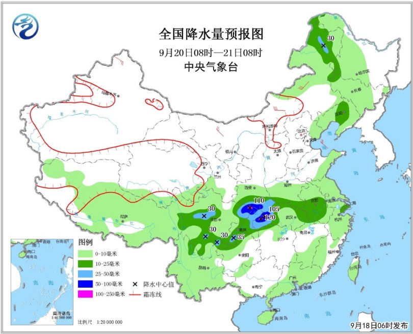 9月20日08時(shí)至21日08時(shí),內(nèi)蒙古東北部、黑龍江西南部、吉林西北部、遼寧中部、江淮、江漢、西北地區(qū)東南部、西南地區(qū)北部和東部等地的部分地區(qū)有中到大雨,其中,陜西南部、重慶北部、湖北西部等地的部分地區(qū)有暴雨或大暴雨(100~120毫米),新疆北部、內(nèi)蒙古北部等地有4~6級(jí)風(fēng)。