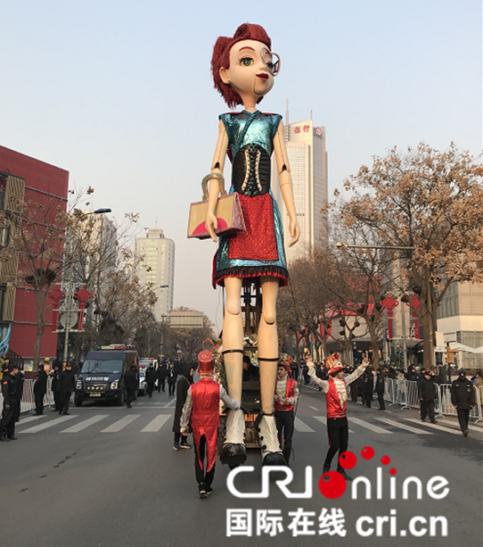 ??西安高新區(qū)跨年活動中花車巡游現(xiàn)場的巨人木偶蘿拉(攝影 陳嵐)