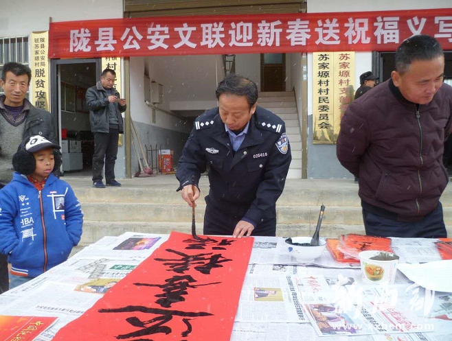 當(dāng)日上午,隴縣公安局黨委委員、副局長聞景帶領(lǐng)局公安文聯(lián)主席、原局紀(jì)委書記馮萬春,公安文聯(lián)副主席張曉全等警營書法愛好者,攜帶筆墨宣紙趕赴蘇家塬村,為廣大群眾義務(wù)書寫春聯(lián)。