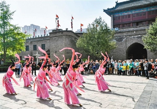 4月7日,市民游客在西安永寧門廣場(chǎng)欣賞仿唐歌舞。(資料圖片) 記者 王健 攝