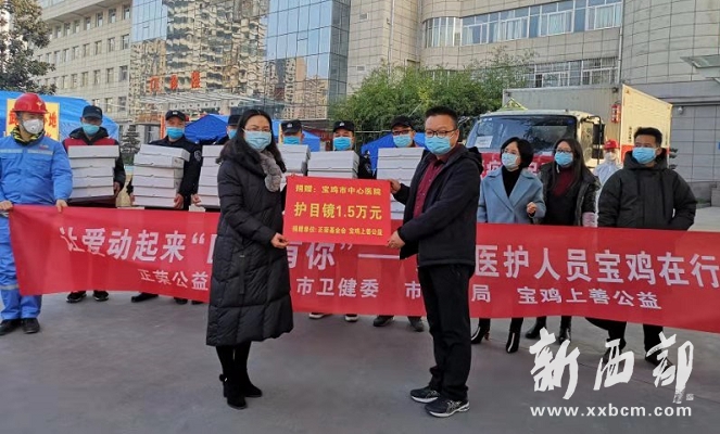 原來,由寶雞市衛(wèi)健委、寶雞市民政局、寶雞上善公益聯合會牽手正榮公益基金會,發(fā)起了讓愛動起來,“醫(yī)路有你”——關愛醫(yī)護人員寶雞在行動公益項目。此次活動共采購價值3萬元的護目鏡,定向捐贈給寶雞市新型冠狀病毒感染的肺炎兩所定點醫(yī)院,市中心醫(yī)院和市人民醫(yī)院的醫(yī)護人員。
