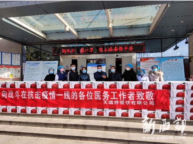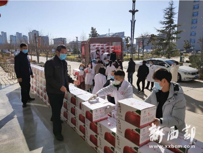 “蘋果寓意著‘平安’,而且還能增加維生素,希望大家平平安安、健健康康?!?月17日,寶雞天瑞祥餐飲有限公司總經(jīng)理何登科把300箱蘋果送到鳳翔縣醫(yī)院時對醫(yī)護人員這樣說道。該公司當天共向鳳翔縣醫(yī)院、鳳翔縣中醫(yī)醫(yī)院和岐山縣醫(yī)院捐贈蘋果900箱。