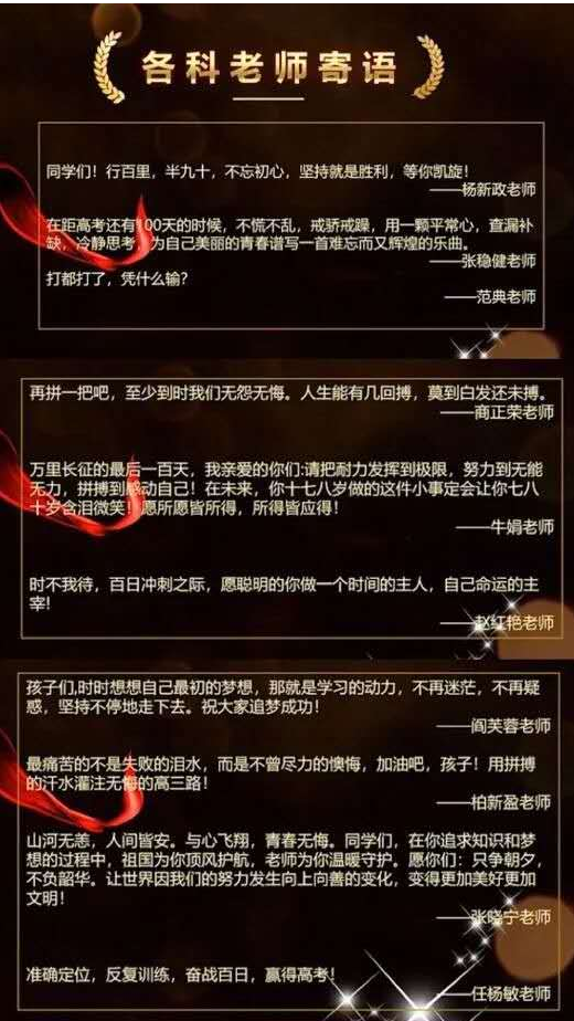 這一百天是你們沖刺前的咬牙堅持,這一百天是你們登頂前的痛苦煎熬,拼搏向上,永不退縮,讓青春留下無悔印記,為你們的高中生活畫上圓滿的句號。親愛的同學(xué)們,你們承載了所有爸爸媽媽的殷殷希望,你們是同齡人中的姣姣者,不論高考結(jié)果如何,你們都是我們心中的驕傲。學(xué)校和家人是你永遠的后盾,請相信自己,堅定信念,因為除了我們自己放棄,沒有什么可以阻擋我們走向成功。