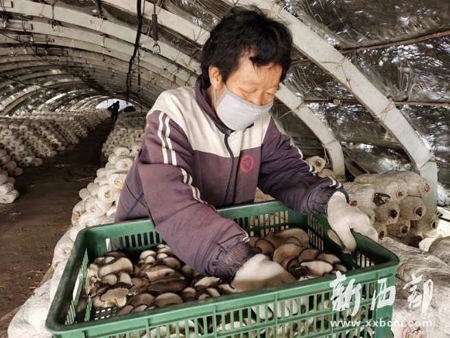 在大棚內(nèi),記者見(jiàn)到了正在采摘平菇的韓長(zhǎng)鳳,她是城關(guān)鎮(zhèn)處禮村人,在這里已經(jīng)務(wù)工七八年了,因?yàn)樯眢w殘疾只能在基地干一些采摘等輕松活,今年春節(jié)期間也一直在上班。